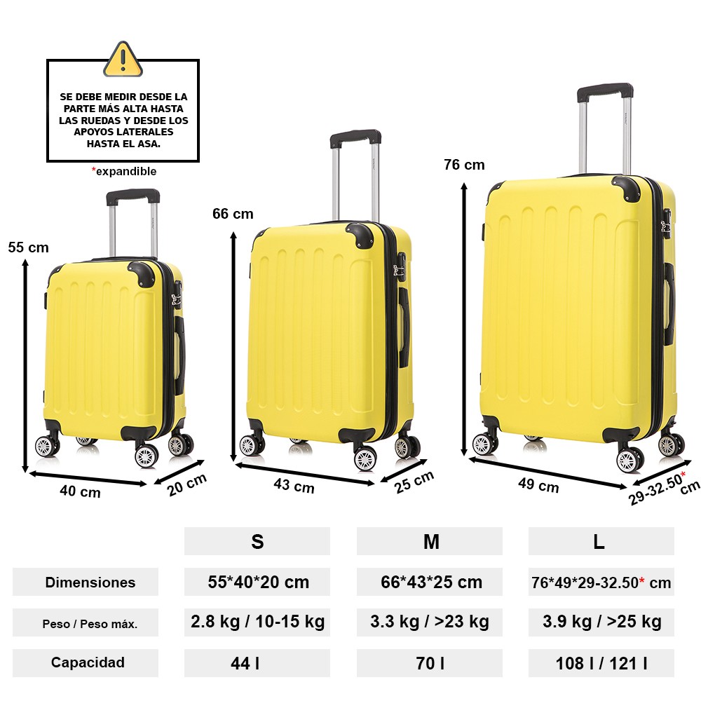 ● Maleta Mediana:66x43x25cm | Peso:3.55 kg | Litro:70L | Material: ABS.