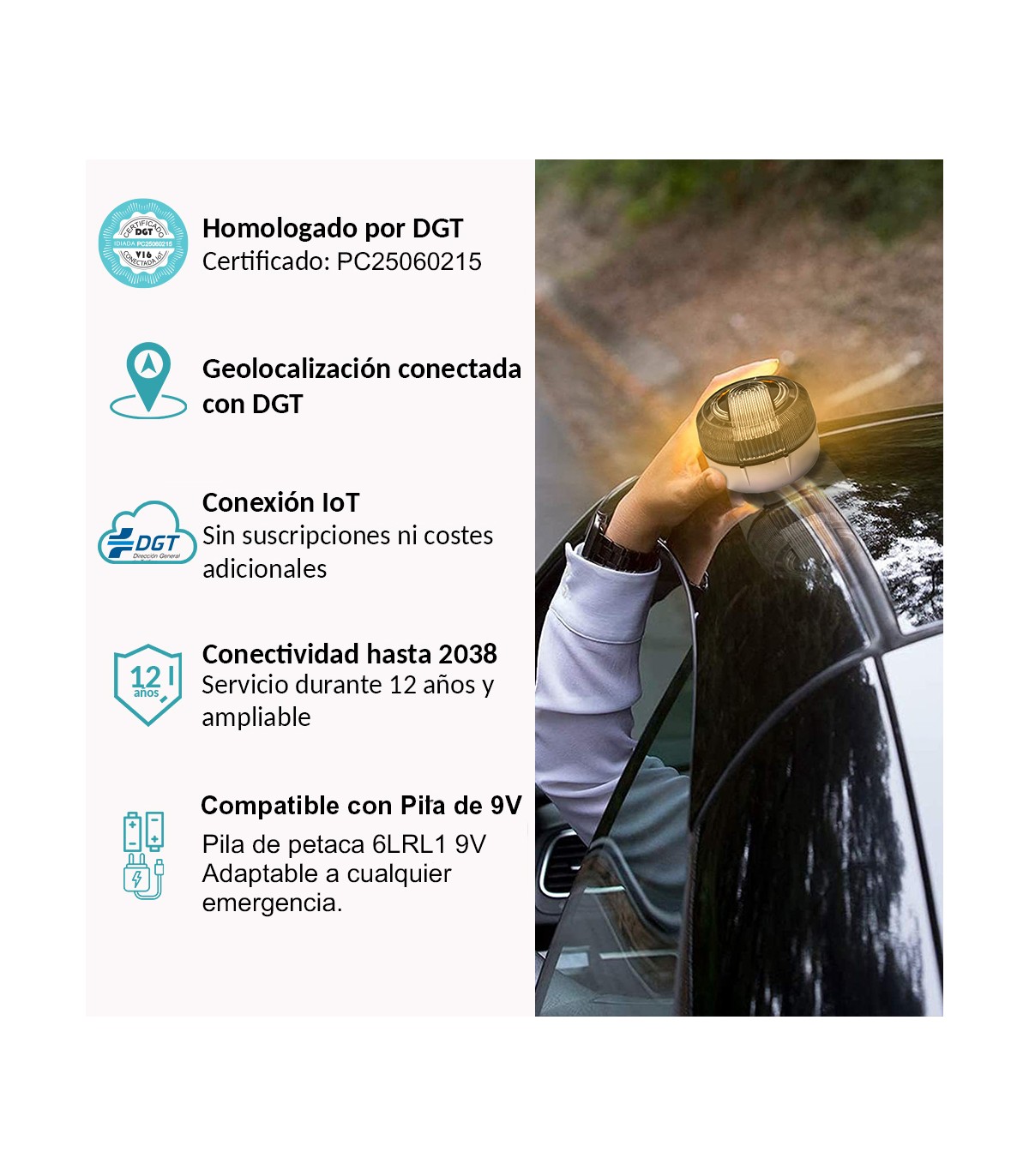 O farol V16 com tecnologia de geolocalização será o único dispositivo legal de pré-sinalização de perigo. Substitui os triângulos de emergência, cumprindo as normas de segurança rodoviária exigidas pela DGT atualmente e as que serão obrigatórias a partir de 1 de janeiro de 2026.